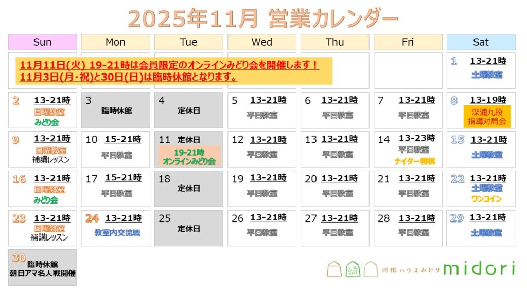 イベント予定(2025年11月の営業カレンダー&イベント予定) 2025 10/30 event lesson 2025年10月30日 2025年11月の営業カレンダーです。 お申込みhttps://forms.gle/R1nRZmYgyhd24LceA event lesson よかったらシェアしてね! URLをコピーしました! URLをコピーしました! 「ながさきピース文化祭2025 将棋の祭典」団体戦で福岡みどり支部が優勝!! この記事を書いた人 kitagawa 関連記事 イベント予定(2025年10月の営業カレンダー&イベント予定) 2025年10月2日 豊川孝弘七段 パワーアップ将棋塾、8月の開催日程確定! 2025年8月1日 イベント予定(2025年8月の営業カレンダー) 2025年8月1日 7/26 佐々木大地七段 指導対局会開催のお知らせ! 2025年7月21日 7/19~20 戸辺誠七段2DAYSイベント開催のお知らせ! 2025年6月24日 豊川孝弘七段 パワーアップ将棋塾、7月の開催日程確定! 2025年6月6日 イベント予定(2025年6月の営業カレンダー) 2025年6月6日 2025年7月12日 雁木王 深浦康市九段イベント開催のお知らせ! 2025年5月24日 コメント コメントする コメントをキャンセルコメント ※ 名前 ※ メール ※ サイト 次回のコメントで使用するためブラウザーに自分の名前、メールアドレス、サイトを保存する。 上に表示された文字を入力してください。